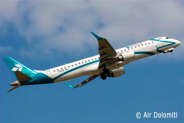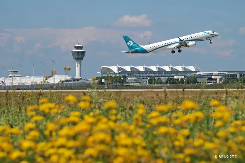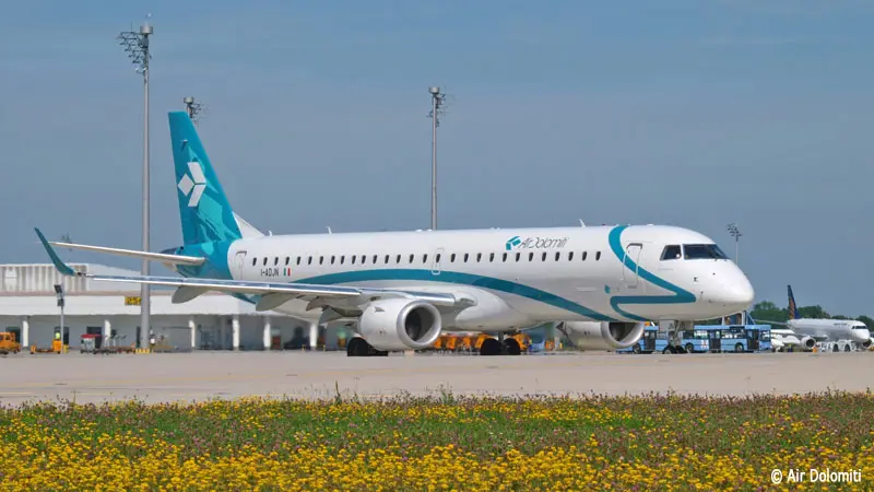 Air Dolomiti opera con una flotta di Embraer 195 da oltre 100 posti, ideale per collegamenti di medio raggio.