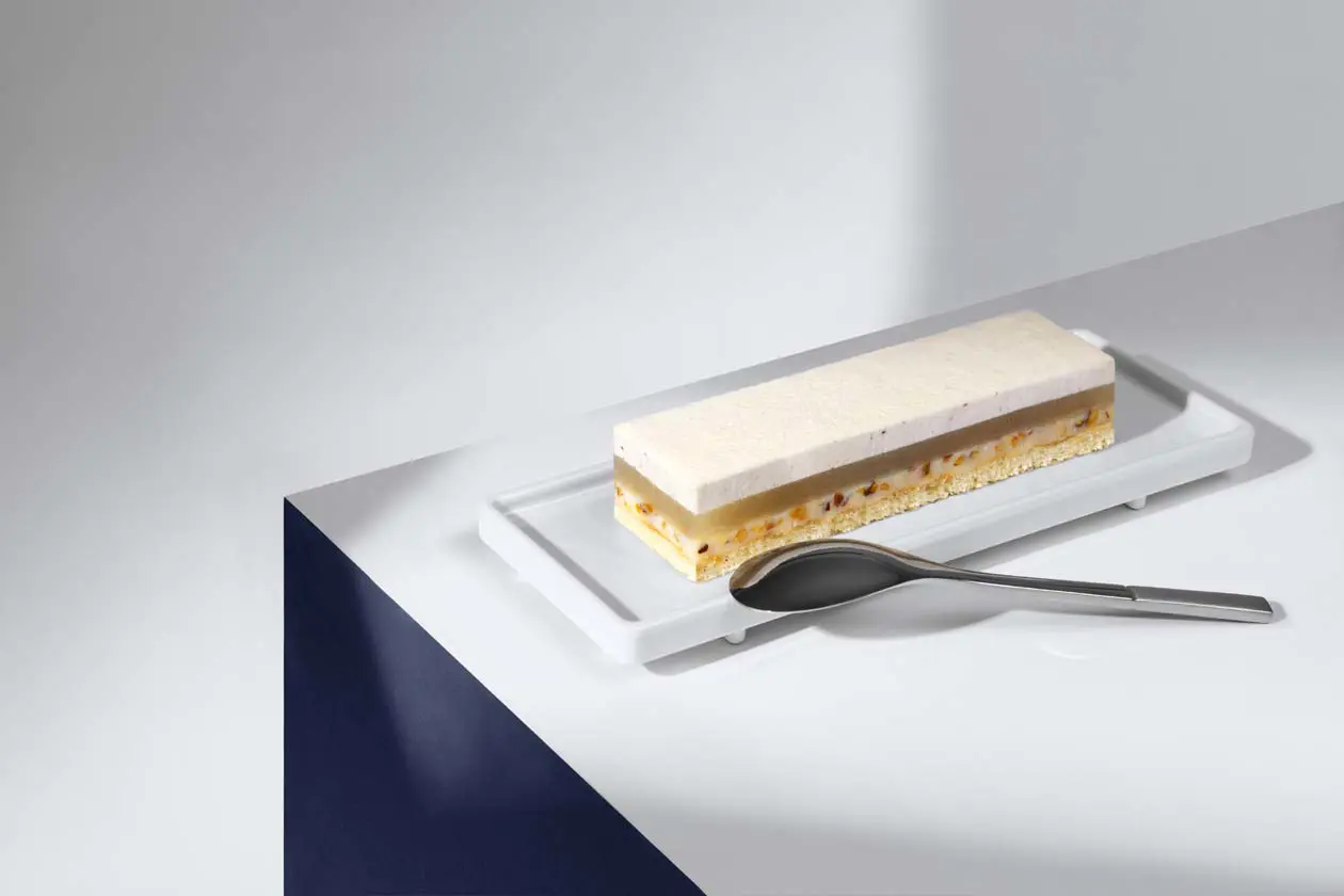 L’offerta dolce si inserisce nel più ampio menu della Business Class Air France sui voli a lungo raggio in partenza da Parigi per diverse destinazioni, attualmente curato anche dallo chef Régis Marcon, tre stelle Michelin e vincitore del Bocuse d'Or. La sua proposta gastronomica si ispira alla natura e alla regione Alvernia-Rodano-Alpi, con piatti che uniscono raffinatezza e autenticità.