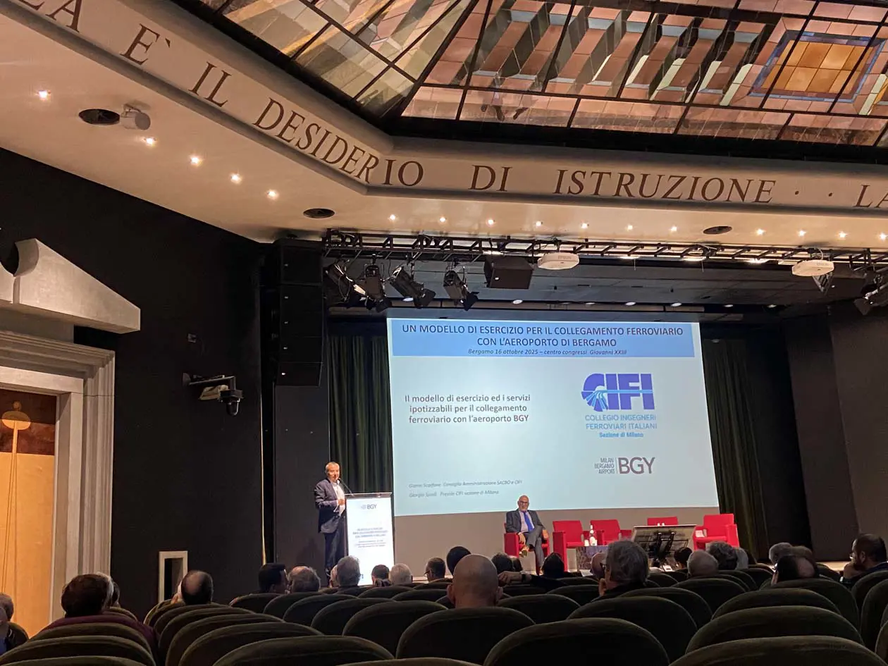 Durante il convegno “Un modello di esercizio per il collegamento ferroviario con l'aeroporto di Bergamo" tenutosi oggi al Centro Congressi Giovanni XXIII di Bergamo ed aperto dall'intervento istituzionale del Presidente di SACBO Giovanni Sanga, il professor Stefano Paleari (UniBG), Diego Deponte (Systematica) e Gianni Scarfone (CIFI) nelle loro rispettive analisi per SACBO, hanno spiegato come il treno rappresenta una leva strategica di crescita e innovazione, in grado di trasformare l’aeroporto in un nodo di mobilità moderno e multimodale, capace di servire non solo chi vola, ma l’intero territorio lombardo.