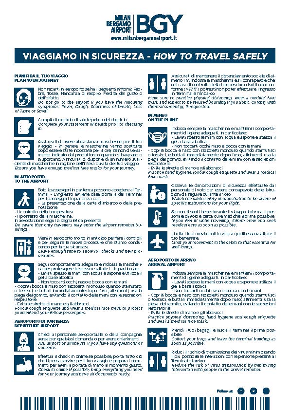Sul sito dell'aeroporto e sui suoi canali social è possibile trovare tutti gli aggiornamenti in tempo reale delle iniziative e delle attività poste in essere per salvaguardare la salute dei passeggeri in transito nello scalo bergamasco.